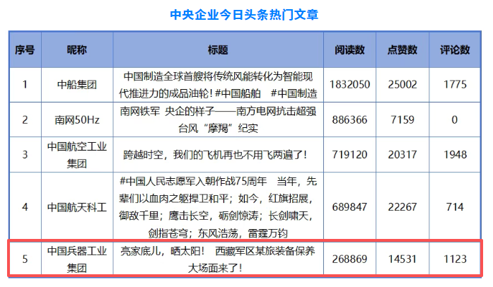 《亮家底兒,曬太陽!西藏軍區某裝備保養大場面來了!》入選中央企業今日頭條熱門文章。
